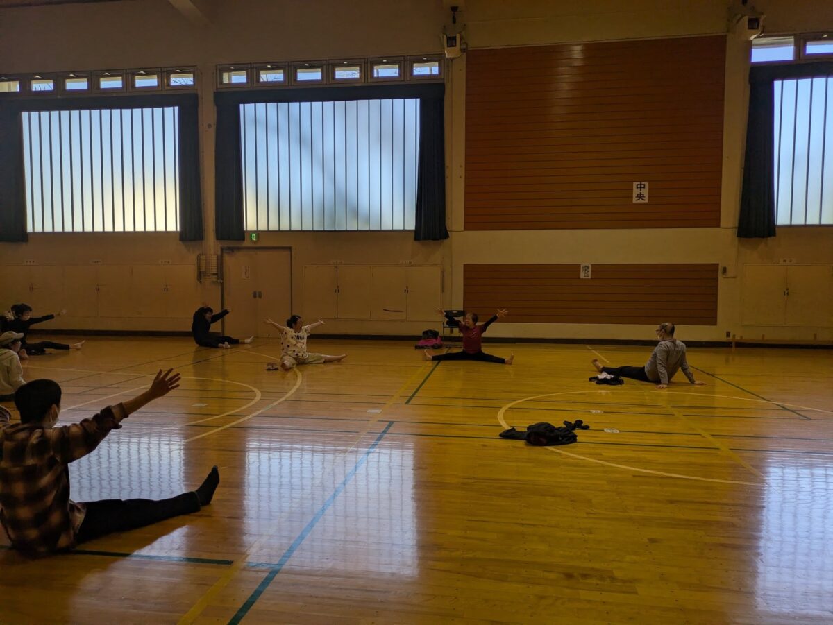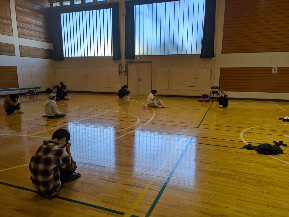 最初はストレッチ!春日町青少年館のレクホールを利用して、出来る人は靴とくつ下を脱いで行いました。