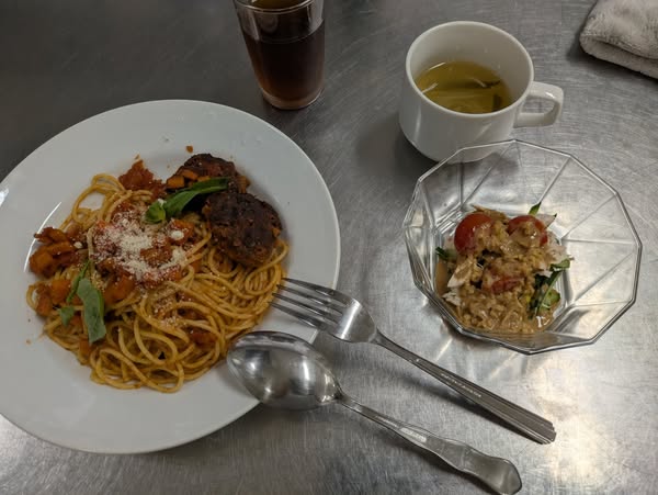 「ミートボールスパゲッティ」はまず、ミートボールから作りました。その後スパゲッティのソースをトマト缶に色んな味と野菜を加えて、ミートボールとスパゲッティをからめて完成!